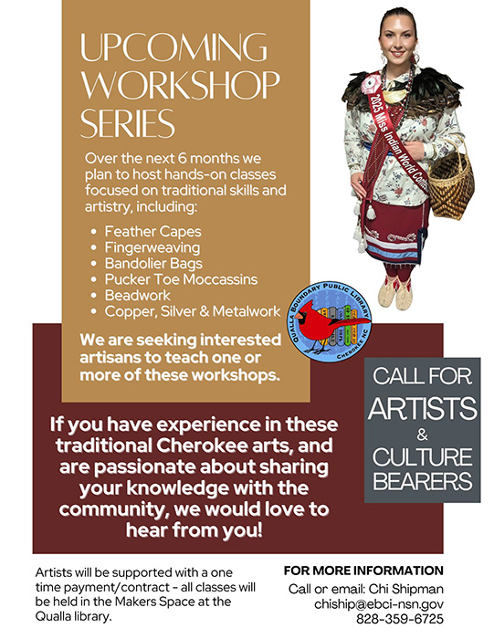 CALL FOR ARTISTS. Over the next 6 months. In the Maker Space in the Qualla Boundary Public Library 810 Acquoni Rd. Cherokee, NC. 28719. Seeking interested artists to teach one or more of these workshops: feather capes, fingerweaving, bandolier bags, pucker toe moccasins, beadwork, copper, silver and metalwork. Infor: Chi Shipman (828) 359-6725 or chiship@ebci-nsn.gov
