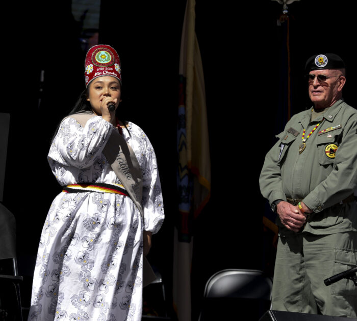 2025-26 Miss Cherokee Marcela Garcia speaks during the Veteran’s Day event at the 113th Cherokee Indian Fair in Cherokee, N.C. on Friday, Oct. 10. (SCOTT MCKIE B.P./One Feather photo)