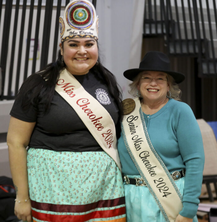 Miss Cherokee 2024-25 Moira George and Senior Miss Cherokee 2024-25 Kimlyn Sneed Lambert are shown at the Cherokee Winter Social at the Peaches Squirrell Sports & Recreation Center in Cherokee, N.C. on Jan. 25, 2025. (SCOTT MCKIE B.P./One Feather photo)