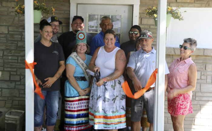 Samantha Bradley, center, a member of the Eastern Band of Cherokee Indians and the western regional director at Sunrise Community for Recovery and Wellness, cuts the ribbon to officially open the Tohi Edasdi (A place of peace) Recovery Community Center in Wayohi (Wolftown) in Cherokee, N.C. on the morning of Tuesday, July 29. Senior Miss Cherokee 2024-25 Kimlyn Sneed Lambert is shown to the left of Bradley. (SCOTT MCKIE B.P./One Feather photo)