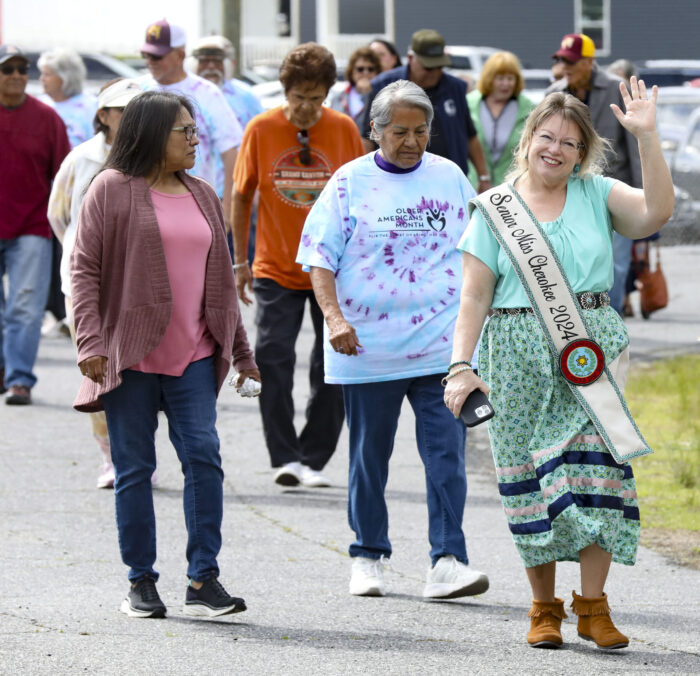 Senior Miss Cherokee 2024-25 Kimlyn Sneed Lambert, right, walks in the Annual Elder’s Walk in Cherokee, N.C. on May 9, 2025. (SCOTT MCKIE B.P./One Feather photo)