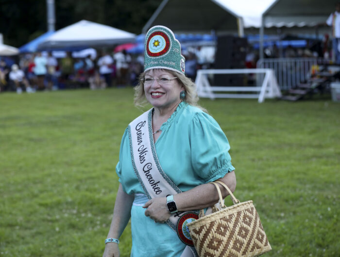Senior Miss Cherokee 2024-25 Kimlyn Sneed Lambert dances in the grand entry at the Eastern Band Cherokee Pow Wow in Cherokee, N.C. on July 4, 2025. (SCOTT MCKIE B.P./One Feather photo)